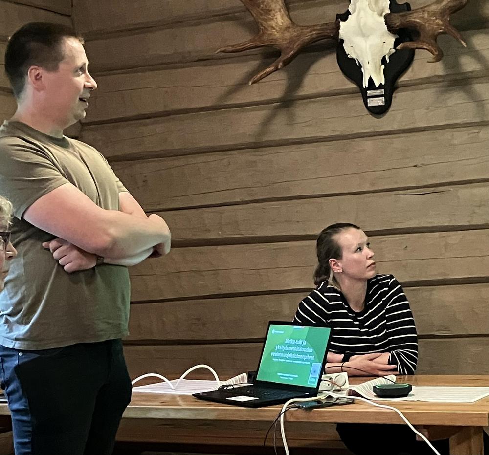 Kuvat alla: Kokousväkeä istumassa, Panu Kukkonen ja Maarit Moisio seuraamassa esitystä, alla Annika Kiiski etäyhteydellä mukana.
