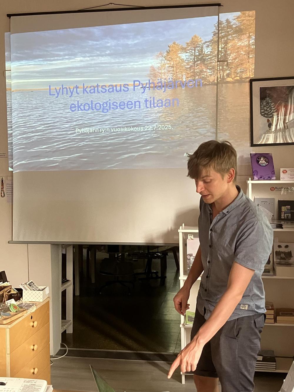 Kokouksen jälkeen Aapo Juvonen kertoi Pyhäjärven tilasta näkösyvyysmittausten ja kemiallisten analyysitietojen valossa. Kokousväki keskusteli vilkkaasti valuma-alueen ongelmista. Asiantuntijana toimi Janne Raassina.