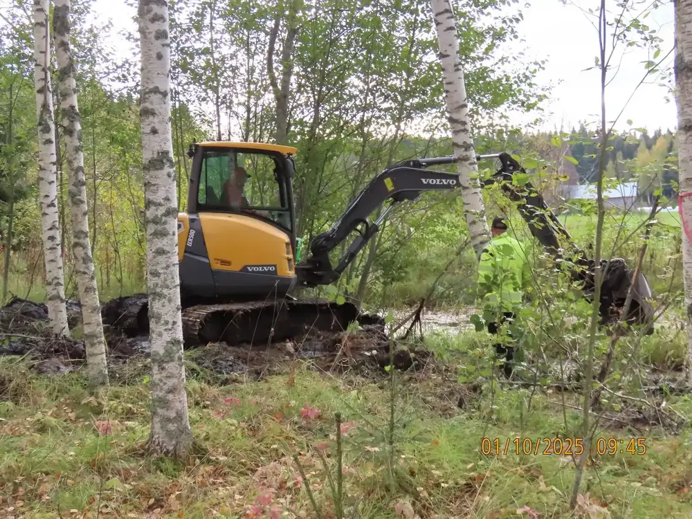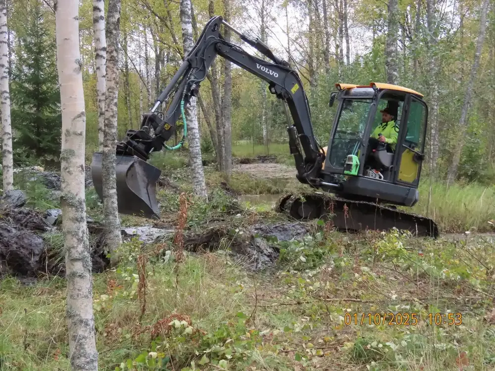 Kuvissa näkyy kosteikon kunnostamistarve. Vesi ei enää kierrä kosteikon uomiin ja kamparakenteisiin. Lokakuun alussa 2025 ehdittiin avata kosteikon reunaa. Talvella 2026 jatketaan märemmällä osuudella. Mutta jo nyt korjaus auttoi. Vesi ohjautuu kosteikkoon puhdistumaan.