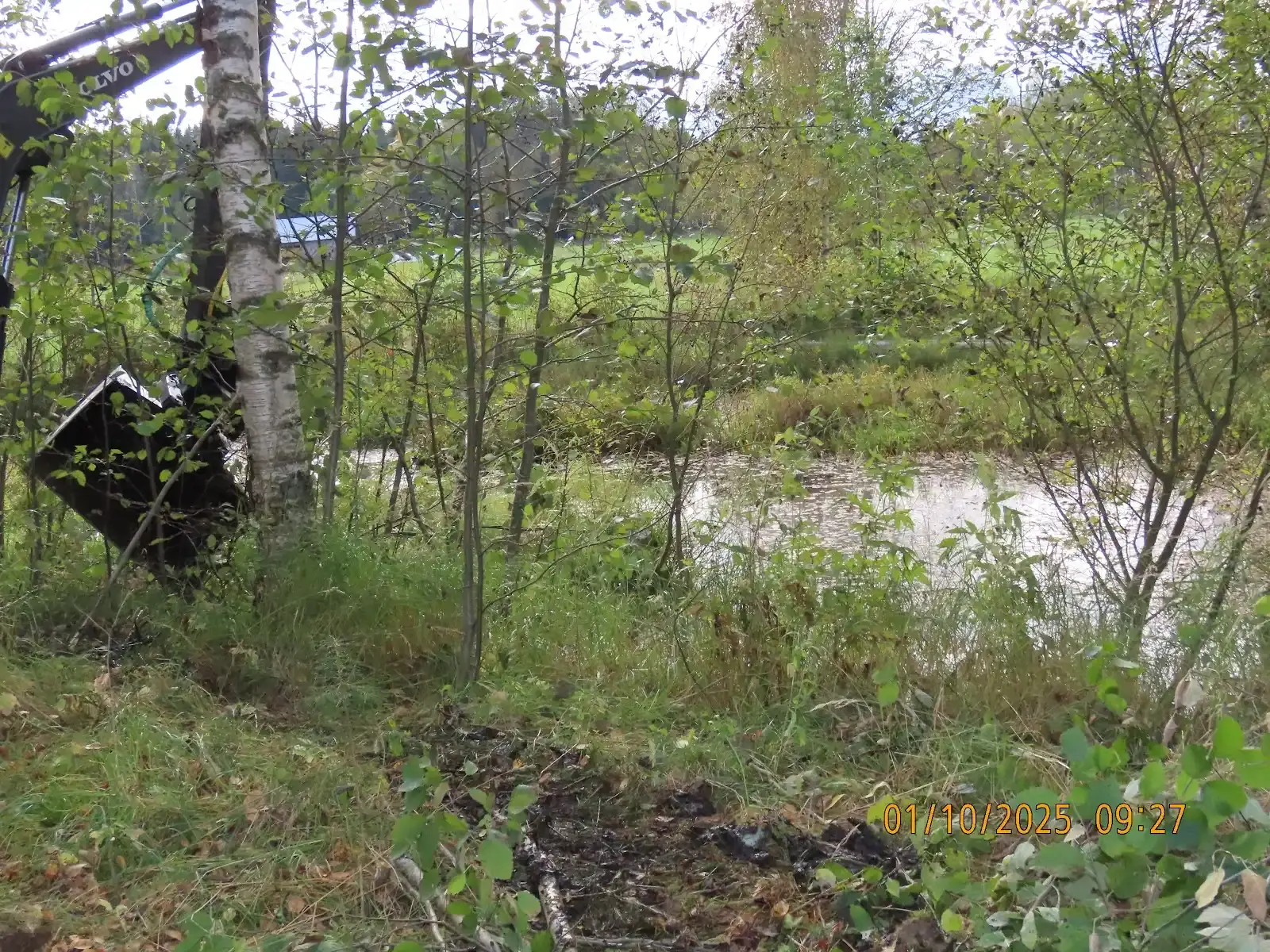 Kuvissa näkyy kosteikon kunnostamistarve. Vesi ei enää kierrä kosteikon uomiin ja kamparakenteisiin. Lokakuun alussa 2025 ehdittiin avata kosteikon reunaa. Talvella 2026 jatketaan märemmällä osuudella. Mutta jo nyt korjaus auttoi. Vesi ohjautuu kosteikkoon puhdistumaan.